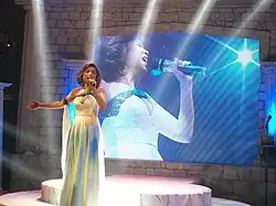 In late 2003, she became part of "Biyahe Tayo", a song patterned after We Are the World which was used to promote Philippine tourism (WOW Philippines). She recorded it along with OPM pioneers including Lea Salonga, Rico Blanco, Sharon Cuneta, the APO Hiking Society and Francis Magalona. (Roxanne Barcelo was also offered to take part in the song)[235] The following year, she was also honored as Singing Ambassador of Goodwill by the Center for Pop Music Philippines for performing for the less-fortunate institutions, fund-raising concerts and inspirational talks to students.[236] Since 2007, she has been participating on the annual Earth Day Jam event.[237][238][239] On April 20, 2008, she and her brother King participated on the Philippine Daily Inquirer's read-along session in celebration of Earth Month.[240] In June 2008, she performed on the first Filipino exposition in the Middle East at the Dubai Trade Centre, which patronized Philippine-made products and brands.[241] In July 2008, she became a representative for "Pose for PAWS," a fundraising event for the animal shelter launched by the Philippine Animal Welfare Society (PAWS).[242] In December 2008, she performed on the fundraising dinner for Ploning entitled Plato Para Kay Ploning, after the film was submitted as Philippine entry for Best Foreign Language Film on the 81st Academy Awards.[243] On May 29, 2009, she supported Friendster Cares, a benefit concert for the education of less-fortunate kids.[244] In August 2009, she performed on YCONCON: Isang Araw Lang – The Sequel concert at the Araneta Coliseum, which supports Daniel Razon's "Free College Education" program.[245]
