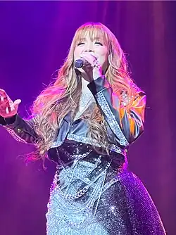 Morissette has stated that Nina's rendition of "Foolish Heart" (2002) inspired her on the use of whistle register.[208] She also credits Nina's toned-down vocal style as it influenced her to be "steady" [sic] in terms of singing.[209] She paid tribute to Nina in one of her recorded live performances.[209] Regine Velasquez has cited Nina as one of her favorite artists[210] and has performed Nina's original songs in her live shows.[211] Sarah Geronimo has also cited Nina as one of her favorite singers,[212] stating that she personally wanted Nina as guest act for her 2005 concert The Other Side.[212] Katrina Velarde has performed a medley of Nina's popular songs in one of her concerts.[213] BTS leader RM,[214] Seventeen's DK[215] and Loona's Chuu[216] have mentioned Nina's songs as some of their favorites. Several Asian pop artists have covered Nina's original songs. In 2009, South Korean boy band Super Junior recorded "What If" (2003) for their album Sorry, Sorry. "Someday" (2006) has been performed by South Korean singers Jessica Jung of Girls' Generation, Krystal Jung of f(x), Urban Zakapa,[217] Kwon Jin-ah,[218] Lee Jin-ah,[218] Jun Hyo-seong,[219] Japanese singer Yoshika[220] and Mongolian singer Khulan.[221]