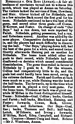 A rare win for Nithsdale, in a friendly against Our Boys (Annan); from the Dumfries and Galloway Standard of 9 November 1887