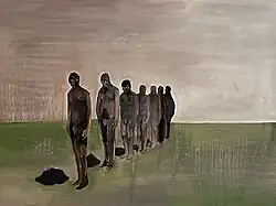 Davis became known for his melancholic portrayals of blurred black figures against barren or shadowy landscapes – paintings that often teetered dangerously into the unreal.[9] During his life he made approximately four hundred paintings, collages, and sculptures. His paintings are both figurative and abstract, realistic and dreamlike; they are about blackness and the history of Western painting, drawn from photographs and from life; they are energetic and mournful in their palette.[10] "He paints what he sees and thinks, expressing the dynamics of his subject with great dignity and simplicity."[11] Davis had advanced compositions that rendered as three-dimensional but remained flat.[10] He was influenced by European painters Marlene Dumas and Luc Tuymans, as well as American painters such as Mark Rothko and Fairfield Porter.