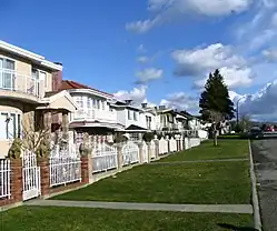 A number of major arteries run through this neighbourhood, primarily the high-traffic Hastings Street connecting North Burnaby with Downtown Vancouver and Port Moody, Willingdon Avenue linking it to Kingsway and Metrotown, and Kensington Ave going south to Canada Way and New Westminster. The neighbourhood is served by several bus routes, including the R5 RapidBus, which runs along Hastings Street and provides connections to downtown Vancouver and Simon Fraser University.[2] The West Coast Express commuter train runs through North Burnaby along Burrard Inlet, but does not have any stations in the neighbourhood.[3]