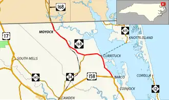 North Carolina Highway 168 (NC 168) is a primary state highway in the U.S. state of North Carolina. Known as Caratoke Highway, the state highway runs 18.28 miles (29.42 km) from US 158 in Barco north to the Virginia state line in Moyock, where the highway continues as Virginia State Route 168 (SR 168) toward Norfolk, Virginia. NC 168 forms part of the primary north–south highway of Currituck County, where it provides access to the county seat of Currituck. The state highway also provides a crucial link for traffic between the Hampton Roads region of Virginia and the Outer Banks.