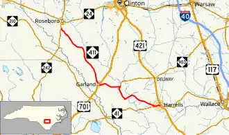 North Carolina Highway 411 (NC 411) is a 27.9-mile-long (44.9 km) primary state highway in the U.S. state of North Carolina. The 28-mile-long (45 km) route connects the towns of Harrells, Garland, and Roseboro, entirely in Sampson County.