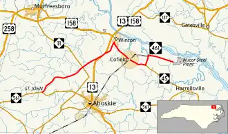 NC 461 was established in 1964 as a new primary routing from NC 561 in Saint John to US 13 south of Winton.[2] In 1999, NC 461 was extended east, with a short concurrency with US 13 it splits near Winton, where it follows along Old Highway 13 to NC 45, then in concurrency until Farmers Chemical Road, where it continues as a new primary spur to the steel plant.[3]