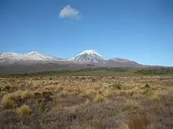 The tallest mountain, Ruapehu, is an andesite cone that was somewhat higher but has been eroded with a 150 km3 (36 cu mi) cone and 150 km3 (36 cu mi) ring-plain.[2] It is typical of the Tongariro Volcanic Centre, whose landforms are defined by the intermediate properties of its andesite magma, having a moderate amount of silica, making it more viscous than basalt, but much less viscous than rhyolite. Andesite magma in effusive eruptions cools to form dark grey lava if gas-poor or scoria if gas-rich. The explosive eruptions tend to be small or moderate sized phreatomagmatic eruptions where the hot magma turns water into steam and the magma into ash. Northwest of Ruapehu is Hauhungatahi, the oldest recorded volcano in the south of the plateau.[2] The other two most prominent volcanic mountains are Tongariro and Ngauruhoe, part of a single composite stratovolcano, like Ruapehu, made up of layers of lava and tephra.