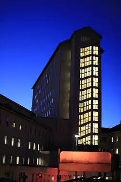 The North Karelia Central Hospital (Finnish: Pohjois-Karjalan keskussairaala) is a hospital located in the city of Joensuu in North Karelia, Finland. It was built in 1953, which makes it the oldest central hospital in the whole country.[1][2] The hospital is located near the city center of Joensuu on the top of Niinivaara, from where its white main building can be seen tens of kilometers all the way to Koli. The height of the 12-storey building is 45 meters.[3] Architects Jussi Paatela together with Olli Pöyry and Marja Pöyry were responsible for the design of the hospital buildings.[4]