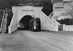 The Northland Tunnel: major earthworks were required to build ramps to link the tunnel's Northland Road, Raroa Road (now Raroa Crescent) and Karori Road[39] now known as Chaytor Street at a gradient suitable for trams. Tunnelling found greasy and treacherous ground requiring double shifts on the tunnelling to complete lining and stabilising as quickly as possible. In view of public concern for the safety of the workmen, a resolution was passed at meeting held under the auspices of the Labour Party requesting that Robert Semple, an expert tunneller, inspect the site. The resolution was referred to the Mayor (Robert Wright) who said that he had no comment to make upon it.[40] The stability of the tunnel remained in doubt. Expensive remedial work was finished in January 1928.[41] A bus service was provided because the roadway on the Northland side had yet to be widened and reinforced to take the weight of the trams. There were lengthy courtroom battles between Council and affected residents which had to be settled before that work could be carried out. The tunnel was opened to trams on 4 June 1929.[42]