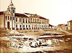 The Santa Casa was founded in 1803, and it took a long time to build a temple to care for the sick within it. The 1st Book of Resolutions of the Brotherhood of the Santa Casa da Misericórdia, in its first entry, dated January 24, 1814, reports the existence of an image of Senhor dos Passos (Our Lord of the Stations of the Cross) owned by the institution of the same name, administered by the Brotherhood of the Blessed Sacrament, and the need to establish a chapel or church in the Public Hospital of the Mercy, where the Blessed Sacrament would be kept so that it could be ministered to the sick by the Brothers of Mercy, and requested funds for this establishment and for the transfer of the image.[1]