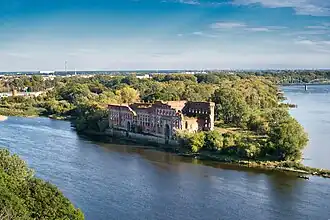 One of the districts of Nowy Dwór is Modlin, created from incorporating the former village of Modlin into the growing town in 1961. Modlin Fortress is now also part of the city. Many structures related to the fort can be seen in the Modlin district, including ruins from defensive structures designed by Napoleon Bonaparte[3] and Tsarist Blocks built between 1899 and 1901 to house soldiers of the Russian army, and which are still in use as private flats today.[4]