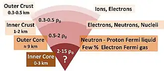 Cross-section of neutron star. Densities are in terms of ρ0 the saturation nuclear matter density, where nucleons begin to touch. Patterned after Haensel et al.,[7] page 12