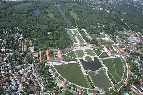 To the east, the park ends at the palace building. On the garden side of the palace (west) follows the large Garden parterre, which constitutes the central part of the large rectangle surrounded by canals. The Garden parterre flanks the Central (axis) canal. The Grand circle (Schlossrondell) is situated to the east on the city side of the palace.[3]