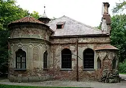 The rectangular Crown Prince’s Garden (Ludwigsgarten) is located northeast of the Amalienburg. It was the first work of Friedrich Ludwig Sckell in Nymphenburg. He created this moderate garden, which already had some characteristics of the English garden style for the young Ludwig I in 1799. The pavilion, a two-storey wooden structure, was also built for him. Its octagonal main part has two rooms on two floors with the same layout. In the portico, which is popularly called the Witch's house, a staircase leads to the first floor. Its exterior painting is intended to give the impression of an artificial ruin. The walls inside are decorated with hand-printed wallpaper. A small brook emerges from between stones as if from a natural rock spring. It is fed from the water of the southern canal via a gradient water pipe. The garden is separated from the rest of the Amalienburg garden by a wooden fence. The Crown Prince's Garden was restored in 1982/83.