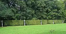 One of its elements was a parterre of flowers, an arbor, that lead to a garden pavilion to the north, in front of which is a round, now dried out water basin, to which leads a staircase. Two parallel beech hedges lead from north to south, each with five niches adorned with Hermes busts on bases. The busts are made of coarse-grained marble, the bases are made of red marble. They may have been made in the late 17th or early 18th century in Giuseppe Volpini's workshop.