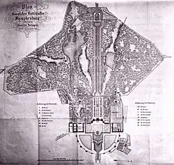 The designs of the original Baroque gardens had largely been modeled on the French gardens at Vaux-le-Vicomte and Versailles. The modern park layout is the result of a fundamental redesign by Friedrich Ludwig Sckell, beginning in 1799. The park area within the Garden wall occupies 180 hectares and the complete complex covers 229 hectares.[8][9]