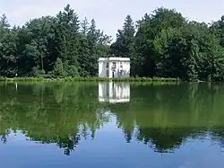 The largest area of the park is occupied by the English-style landscape garden. The northern part is defined by panoramic vistas of the Pagodenburg Lake with the Pagodenburg and the Pagodenburg valley, A meadow valley is running to the north with a brook, that flows into the Kugelweiher pond. The southern part is even more diverse with a panoramic vista of the large Badenburg Lake, It allows visitors views of the water surface at the Apollo temple (built in the form of a monopteros) and the Badenburg, behind which a wide meadow valley, called the Löwental (Lion Valley) leads to the south, as well as to a hamlet, the Amalienburg and the Crown Prince Garden south of the Great Parterre.[9][28]