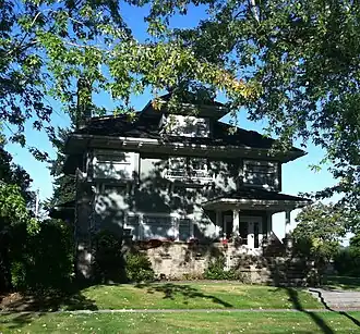 The home is a 2+12 story, American Foursquare style residential structure.[a] Following standard Foursquare design, the house rests upon a squared, sandstone foundation and contains a basement. The Palmer House contains a large front porch with several broad pillars. Other features include bay windows, a low-pitched hipped roof and dormers, and distended eaves.[3]