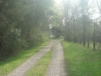 ![]() The front drive of Oak Hill, seen in April 2017; the house is barely visible behind the trees in the near distance | |