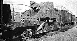 The mobile battery consists of four railroad cars. Two cars have an 8-inch rapid-fire gun, there is an ammunition car that is between the two gun cars, and a telescoping observation car.[4] The advantages of the Schneider train were that it was less costly than a fixed battery of the same firepower; the train allowed a degree of secrecy since it was not in a fixed location; ease of maintenance since it could be stored in a train shed; there was no need to construct new roads for its use; and any railroad tracks laid for its use can also be used by passenger and freight haulage.[5] The cars of the train were arranged with the train engine first, followed by the observation car, then the first gun car, the ammunition car, and then the second gun car. The observation car was placed near the engine so that the commanding officer could more easily place the train where required. The ammunition car was placed between the two gun cars to provide the shortest distance to move the artillery shells to each gun.[5]