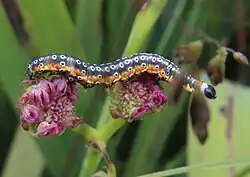 Larva of the moth Depressaria daucella on tubular water-dropwort flowers at Marden, Kent