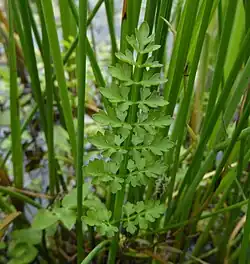 The leaves vary widely in shape, with the upper ones being typically pinnate and having narrow, almost linear segments, while the lower ones can be 2- or even 3-times pinnate, with broader, flat leaflets, more like those of other umbellifers. The leaf stalks of the upper leaves are fistular, like the stem, and longer than the pinnate leaf blade.[2]