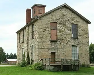Prairie du Chien opened its first public school in 1846, though private schools operated as far back as the 1810s. The town built the Old Rock School in 1858 after outgrowing its original schoolhouse, as its population grew rapidly in the 1850s. The two-and-a-half story stone building cost nearly $4,000 and was funded through a special tax approved by the Wisconsin Legislature, as state law at the time only allowed school districts to raise $300 in taxes. The building had a Greek Revival design with a Palladian window on the attic level, a wooden canopy over the entrance, and a cupola atop the gable roof. The school operated until 1926; the building went on to serve as a community center and meeting area for local groups.[2][3] In the 1980s, a memorial was added to the site to honor local soldiers who served in wars from the Black Hawk War to World War II.