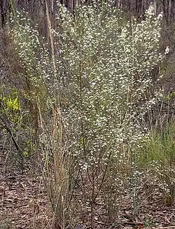 Olearia teretifolia grows in forest, mallee and scrub in disjunct areas of Victoria and in the south-east of South Australia.[2][3]