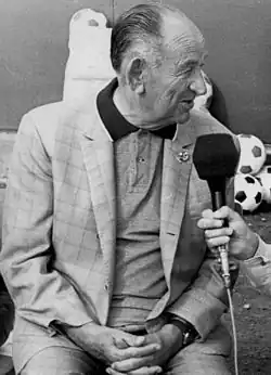 In 1963, Olympiacos became the first ever Greek club to win a non-domestic competition, winning the Balkans Cup, which marked the first international success by any Greek football club. The Balkans Cup was a very popular international competition in the 1960s (the 1967 final attracted 42.000 spectators),[49] being the second most important international club competition for clubs from the Balkans (after the European Champions' Cup).[49] Olympiacos topped his group after some notable wins, beating Galatasaray 1–0 at the Karaiskakis Stadium (Stelios Psychos 49'),[50] as well as FK Sarajevo (3–2) and FC Brașov (1–0), bagging also two away draws against Galatasaray (1–1) in Mithatpaşa Stadium (Metin Oktay 78' – Aristeidis Papazoglou 6') and FK Sarajevo in Koševo Stadium (3–3).[50] In the final, they faced Levski Sofia, winning the first match in Piraeus (1–0, Giorgos Sideris 37') and losing the second match in Vasil Levski Stadium with the same score.[50] In the third decisive final in Istanbul (a neutral ground), Olympiacos beat Levski 1–0 in Mithatpaşa Stadium with a goal by Mimis Stefanakos in the 87th minute and won the Balkans Cup.[51] The club went on to win the 1963 and 1965 Greek Cups, completing seven Greek Cup titles in nine years. However, the years 1959–1965 were not fruitful for Olympiacos in the Greek Championship, as the team was not able to win the title for six years. This mediocre performance led Olympiacos board to hire the legendary Márton Bukovi as the club's head coach, with Mihály Lantos (prominent member of the Hungary national team of the 1950s widely known as the "Mighty Magyars" or "Aranycsapat") as his assistant coach.[52] The innovative Hungarian coach, pioneer of the 4–2–4 formation (along with Béla Guttmann and Gusztáv Sebes) was a solid tactician and favoured attacking football and very demanding training sessions.[52] Bukovi's innovatory tactics and groundbreaking training methods transformed Olympiacos and created a powerful, attacking team with constant player movement and solid combination game that often played spectacular football.[53] Under Bukovi's guidance and with the great performance of key players such as Giorgos Sideris, Nikos Gioutsos, Kostas Polychroniou, Vasilis Botinos, Aristeidis Papazoglou, Pavlos Vasileiou, Giannis Gaitatzis, Christos Zanteroglou, Grigoris Aganian, Mimis Plessas, Giannis Fronimidis and Orestis Pavlidis, Olympiacos won 2 straight Greek Championships (1966, 1967).[53] They won the 1966 title with 23 wins and 4 draws in 30 games and in the decisive away match against Trikala, an estimated 15,000 ecstatic Olympiacos fans swarmed into the city of Trikala to celebrate the win (0–5) and the Championship title after seven years.[54][55]