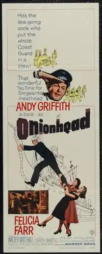 Onionhead is a 1958 American comedy drama film set on a U.S. Coast Guard ship during World War II, starring Andy Griffith and featuring Felicia Farr, Walter Matthau, Erin O'Brien, James Gregory, Joey Bishop and Claude Akins.[3] It is directed by Norman Taurog and is written by Nelson Gidding and Weldon Hill from Hill's novel. Weldon Hill is the pseudonym of William R. Scott, a native Oklahoman who based the novel on his own World War II service in the Coast Guard.
