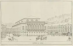The first stone was laid on 1 July 1818 by Mademoiselle Mars.[1] Built according to the plan of the architect Auguste Dukers, the theatre in the neoclassical style has a massive parallelepipedic shape. Its main façade is decorated with a marble colonnade[alpha 1] limited by a balustrade and overlooking the arcades on the ground floor. The Théâtre royal de Liège was inaugurated on 4 November 1820.