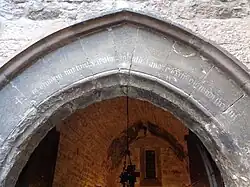 This inscription reflects the legend that Francis was born to his mother in a stable in the presence of livestock, just as the Gospel according to Luke depicts the Nativity of Jesus. The story is not part of either Bonaventure’s or Thomas of Celano’s Lives of Francis, nor is it to be found in the famous Little Flowers of Saint Francis. It does not appear until at least the late 14th century and the inscription and chapel themselves are the earliest surviving record, dated to between 1316 and 1354.[3]