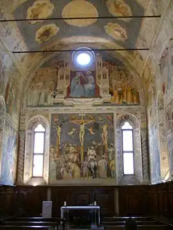 The Crucifixion fresco on the wall above the altar depicts Christ on the cross while Mary weeps below, consoled by apostles and followers. His cross bears a sign reading "INRI," an acronym for the Latin phrase Iēsus Nazarēnus, Rēx Iūdaeōrum ("Jesus the Nazarene, King of the Jews.") Angels surround Christ in the sky, framing him as the central figure, directing the viewer's eye back to him. Altichiero utilizes foreshortening on the flying angels and the grey horse in the foreground to create the illusion of a realistic perspective.[2]