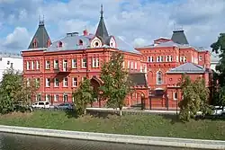 In central Oryol, streets fan out from the fortress; two main axes are the Upper and Lower Korchak Roads. Opposite the fortress was probably a second marketplace in the Zaotsk section, where the dragoon settlements had a relatively-regular layout along the river. Away from the river, the grid becomes a fan. The city – its fortress, three marketplaces, two monasteries and a number of parish churches – was developed from the river. Its structure was visible from the Oka: the central fortress, the fan-shaped center and the grid of the Zaotsk settlements. The city was connected by bridges, making Oryol a military fortress and a trade center.[13]