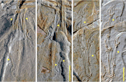 Furrows (yellow arrows) in the hand bones of Ostromia (a,b) and Anchiornis (c,d)