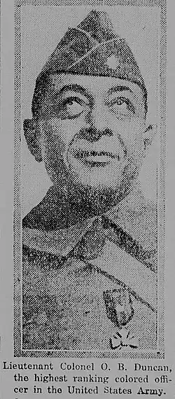 Otis Beverly Duncan (November 18, 1873 - May 17, 1937) was an officer in the United States Army. He was the highest-ranking African American in the American Expeditionary Forces at the end of World War I, serving as a lieutenant colonel in the 370th Infantry Regiment. His regiment was the only combat unit commanded by African American officers.[1]