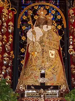 AttributesBlessed Virgin Mary, crowned and draped with a gilded cope, while carrying the Child Jesus holding a scepter