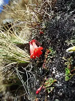 Ourisia chamaedrifolia is one of five species of Ourisia in the Tropical Andes, together with O. muscosa, O. pulchella, O. biflora, and O. cotapatensis.[8] All five species are in the herbaceous subgenus Ourisia.[4] Of these, O. chamaedrifolia is distinctive in its long, red or orange-red, glabrous, tubular corollas.[8] Although the pollination biology of O. chamaedrifolia has not been studied, the colour, shape and vertical orientation of its corollas suggests hummingbird pollination.[9]