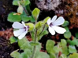 Close-up of flowers showing white corollas with purple inside the corolla tube, and mixture of glandular and non-glandular hairs on the calyx and pedicels