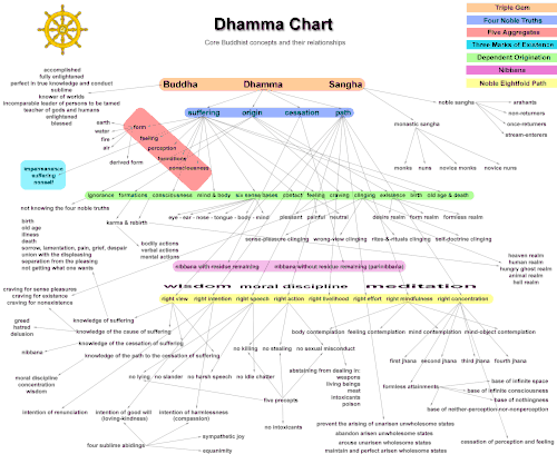 • Dhamma (Dharma) — the cosmic principle of truth, lawfulness, and virtue discovered, fathomed, and taught by the Buddha; the Buddha's teaching as an expression of that principle; the teaching that leads to enlightenment and liberation
