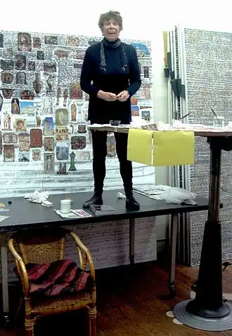 As PINK was struck by the impossibility of expressing essentials in words, she started scripting her stories in disordered alphabets on canvas.[nb 16] Her paintings Letters from Arcadia are in fountain pen on canvas or palimpsest.[nb 17][51][54] Letters to Family, a cycle of art works and installations, are communications with those PINK regards as close relatives and soulmates who live on in museums and libraries (such as Samuel Beckett, Franz Kafka, Velimir Khlebnikov, James Lee Byars, Louis-Ferdinand Céline, Joseph Beuys, Piet Mondriaan, Kazimir Malevich, Marcel Broodthaers, Alberto Giacometti and The Unknown Artist). Letters from the Ferryman (2001) is a series of double portraits of strangers (painted and written).[55][56] Encyclopedia Arcadia (begun 2001) is a series of books: Passions, Scripts, Prayers, Alchemy, Scriptures, Omens, Scores, Discoveries, Torn Mirages and Inventories.[57] Blanchir l'Histoire (2002–2007) is a cycle of eight paintings, 265 by 200 centimetres (104 in × 79 in) each, in which PINK explores the roots of the written word from Sumerian to Hebrew.[58][59][nb 18] In LOT of PINK (2007), the artist explores "lot" in a project where people buy a numbered artwork derived from Standing Stone with the possibility of winning a second work.[60] Satellite View on Arcadia (begun 2008) is a series of collage paintings, with torn, thin blotting paper fixed on canvas with oil paint.