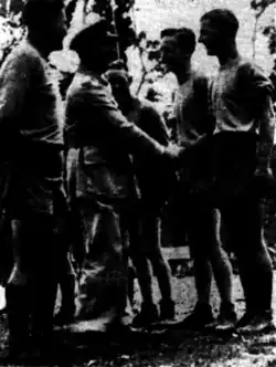 In May 1943, serving in the Territory of Papua during the New Guinea campaign began an informal league which were among the earliest recorded matches in Papua New Guinea. The league consisted of teams including Konedobu, Wirraways, Razorback, Strafers, Wallabies, Pioneers, Bower Birds, Ack-Redians, John's Gully.[4][5] On 29 April 1943, an RAAF team held a secret training session.[6] Its first match was held that weekend on the 1st May.[7] Another higher profile match was held on the 5 May 1943 featuring several notable Australian players.[8] On Saturday 22 May 1943, RAAF Wirraways 13-10 defeated Razorback 9–8.[9] On the 30 May 1943, John's Gully R.A.A.F. Australian Rules football team against a Waigani Road team at the Gully Oval, the R.A.A.F. Wirraway Australian Rules football team also called for opponents.[10] Other teams included Regiment and Con. Depot.[11]