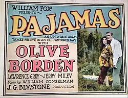 Pajamas is a 1927 American comedy film directed by John G. Blystone and written by William Conselman and Malcolm Stuart Boylan. The film stars Olive Borden, Lawrence Gray, J.J. Clark and Jerry Miley. The film was released on October 23, 1927, by Fox Film Corporation.[1][2][3]