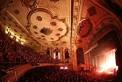 The balcony level extends over two-thirds of the sloping main floor. The heavily decorated ceilings and walls include pilasters rising to complex entablatures, statuary, and arches framing the wall boxes. A Czech made crystal chandelier hangs from the ceiling. The orchestra pit can be raised and lowered by an elevator.[4]