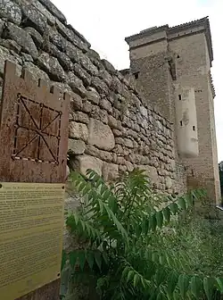 The Medieval fortress of Igúzquiza was partially demolished and rebuilt in brick, with a palatial character.[6] This ancient castle, rebuilt as a palace in the middle of the 15th century by Ferran Vélaz de Medrano y Ruen, preserves the large courtyard of arms, with its low battlemented walls flanking its entrance, rising in its southeast corner a high square tower, rebuilt in that century on a base of ashlar and the rest of brick. In the northeast corner, there is another stone tower, of lesser elevation at present, covered with ivy, preserving between them. The north side of the castle consists of large stables, dismantled rooms, and other dependencies, among which there is a small oratory, with a dark oil painting, a spacious kitchen with its carved stone fireplace, a spiral staircase, and thick walls, which denote the strength of such a fortress.[6]