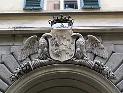 The front of the palace can be traced back to the 1830s, with a large shield on the door with the coat of arms of the Famiglia Borghese (truncated in the 1st gold, to the eagle with unfolded flight of black, crowned of the field, in the 2nd azure, to the dragon of gold), supported by two eagles and surmounted by a wrought-iron princely crown.[1]