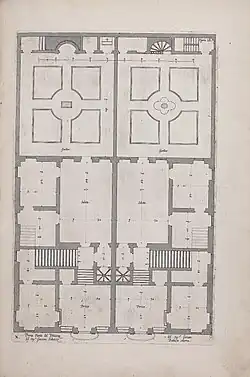 The cousins Lazzaro and Giacomo Spinola (from Luccoli) had the palace built between 1583 and 1588. The attribution of two distinct house numbers is due to the fact that the palace, although it consists of a single building, is made up of two distinct and symmetrical dwellings, a feature that makes it unique among the palaces of Strada Nuova. The absolute symmetry conceived by the unknown architect who oversaw its construction characterises both the facades, the floor plan and the gardens, as can be seen in the surveys made by Rubens for the 1622 edition of the Palazzi di Genova.[1] The uniqueness of the double construction is still highlighted by the presence of the two identical portals facing the street.