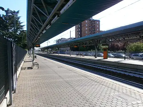 Palazzolo Milanese railway station is a railway station in Italy. It serves Palazzolo Milanese, a neighbourhood in the municipality of Paderno Dugnano. It was the first station of this line to be modernized with lifts, new and taller quays, shelters and underpasses. The station is located on Via Alessandro Coti Zelati.