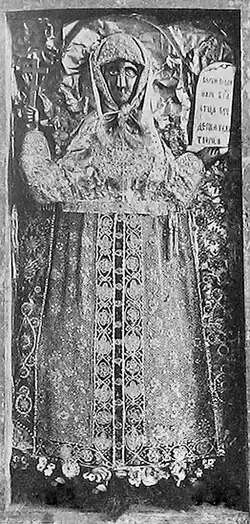 The image of Paraskeva Pyatnitsa according to folk beliefs is different from the iconographic image, where she is depicted as an ascetic-looking woman in a red maforiya. The carved icon of Paraskeva Pyatnitsa from the village of Illyeshi is widely known. It is revered in the Russian Orthodox Church as a miracle worker and is housed in the Trinity Cathedral of the Alexander Nevsky Lavra in St. Petersburg.[3]