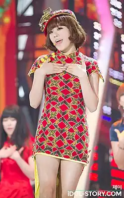 On January 23, 2015, Park debuted as a solo singer with the trot song "Not An Easy Girl" (쉬운 여자 아니에요).[20] The music video used footage from the 1961 film adaptation of Chunhyangga, with Park playing the protagonist.[21] On February 11, she released a duet song, "Goodbye PMS", with comedian Park Myung-soo.[22] The song was written by Duble Sidekick, who said PMS (which usually means premenstrual syndrome) refers to "a monster that creates all the worries and stress suffered by a high school girl".[23] Park also had a supporting role in MBC's drama Angry Mom, which aired from March to May.[24][25]