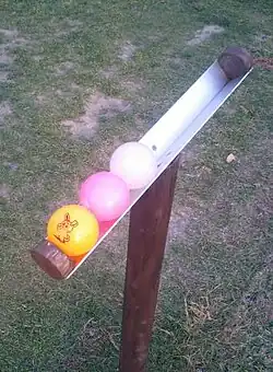 Park golf balls are used in the sport of park golf. They have a weight less than 100 grams (3.5 oz) and diameter of 60 millimetres (2.4 in) and are constructed of durable synthetic resins. They may be translucent or opaque and are manufactured in many different colours. Balls from different manufacturers vary significantly in the way they perform contacting the club, flying through the air and rolling on the grass.