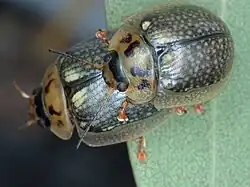 Paropsisterna agricola or southern eucalyptus leaf beetle, is a small hemispherical leaf beetle. They can vary from golden to grey. They have some black markings on the pronotum. The epipleura (skirt) is sometimes red.